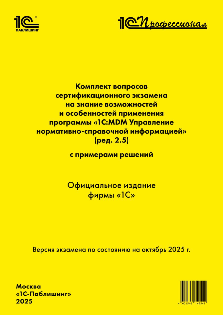 | 4601546149541 | Комплект вопросов сертификационного экзамена на знание возможностей и особенностей применения программы “1С:MDM Управление нормативно-справочной информацией” (ред.2.5), октябрь 2025 |